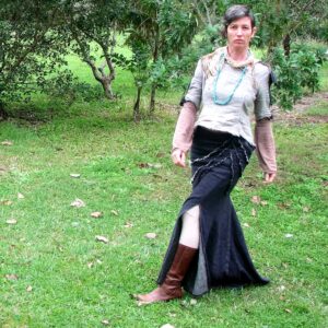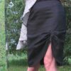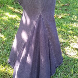 Long, graceful denim skirt with sweeping hem and fishtail train on the back. Flattering curved panel design on the front.