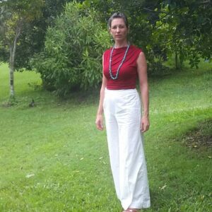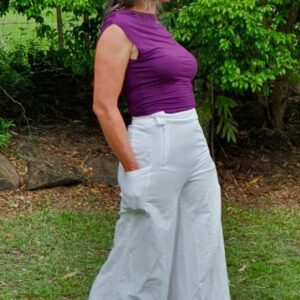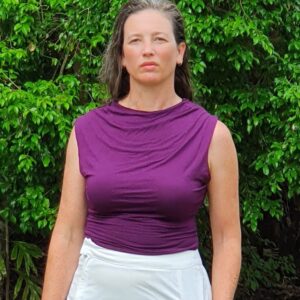 Soft and stretchy bamboo spandex in deep Italian Plum, it’s tight fitting at the waist so when you downward dog it won’t flip over your head.