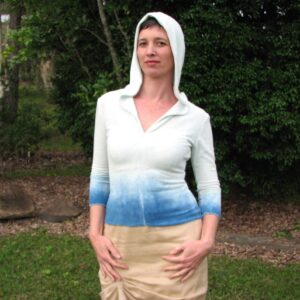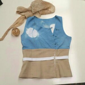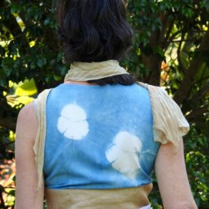 Rock the tailored look in comfy natural fabrics! The top part is bamboo sateen that I folded flower shapes into and dyed in indigo. The bottom part is latte coloured hemp panels, with a white hemp waistband, to accentuate your waist.